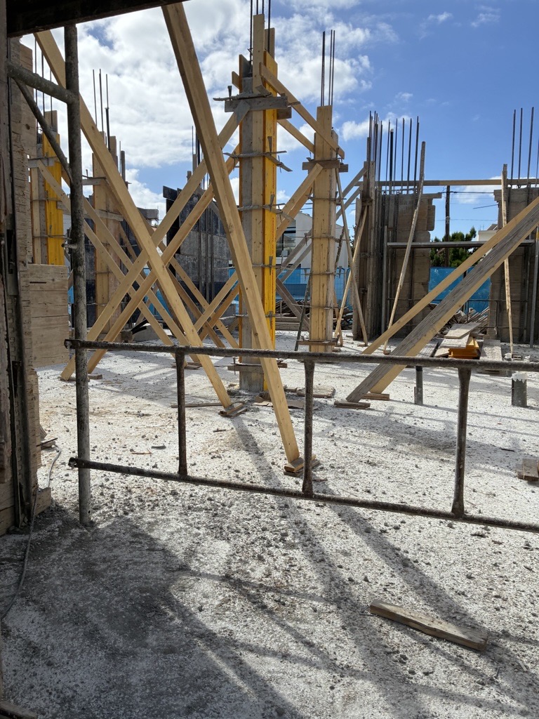 It consists of two bedroom apartments. The structural system is a reinforced concrete frame of shear walls and downstand beams with a two way spanning slab.